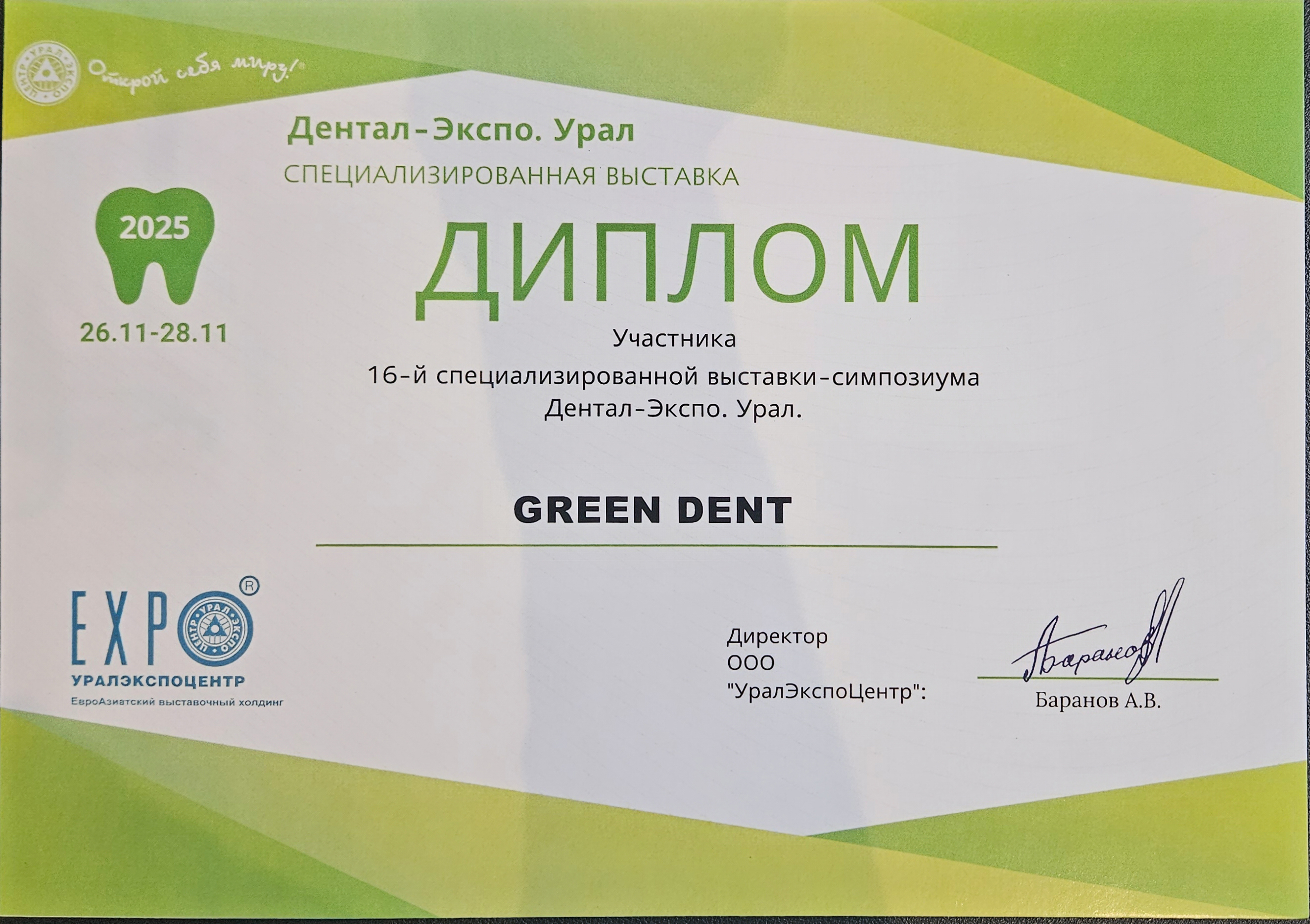 Диплом участника Дентал-Экспо Урал 2024