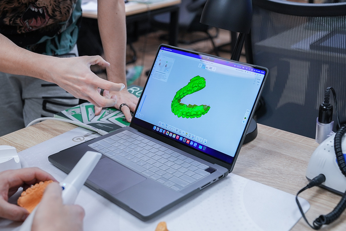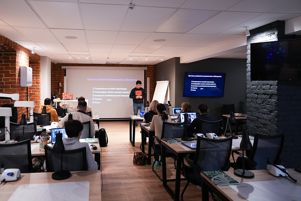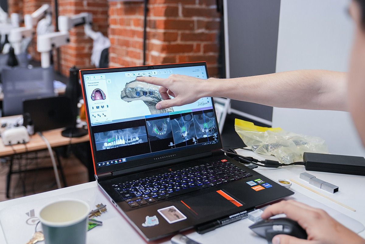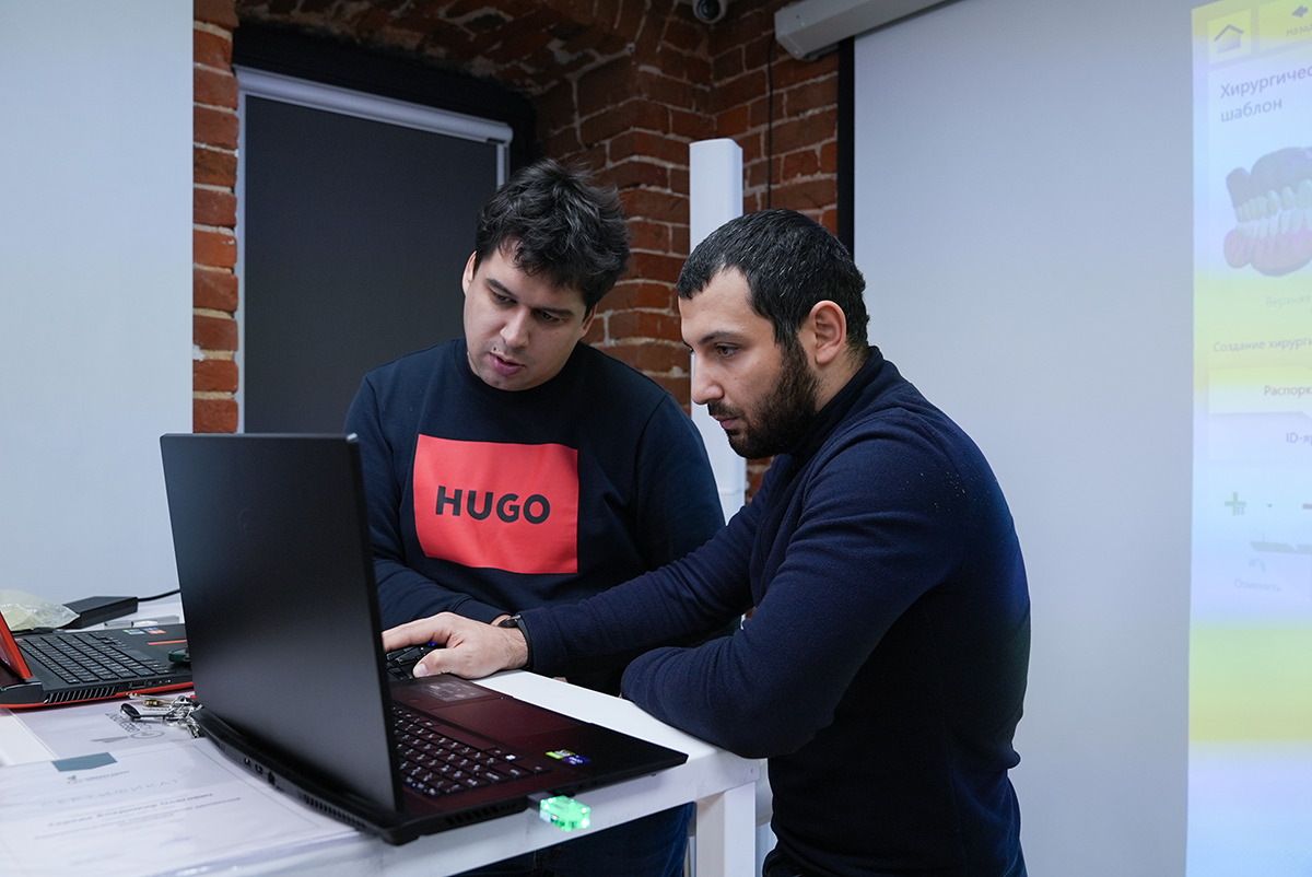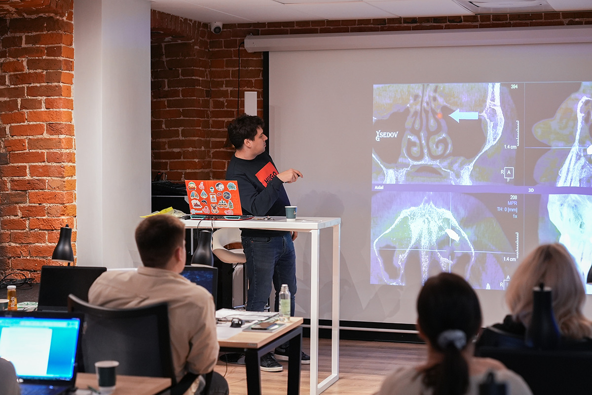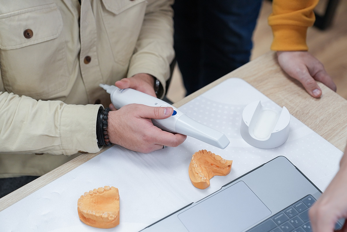 Руки держат высокоскоростной интраоральный сканер Medit i700, глаза направлены на снимок, где видна каждая деталь сканированной области, а уши улавливают новую информацию о рентгенологическом сопровождении дентальной имплантации – это то, что чувствует каждый участник курса Юрия Седова.