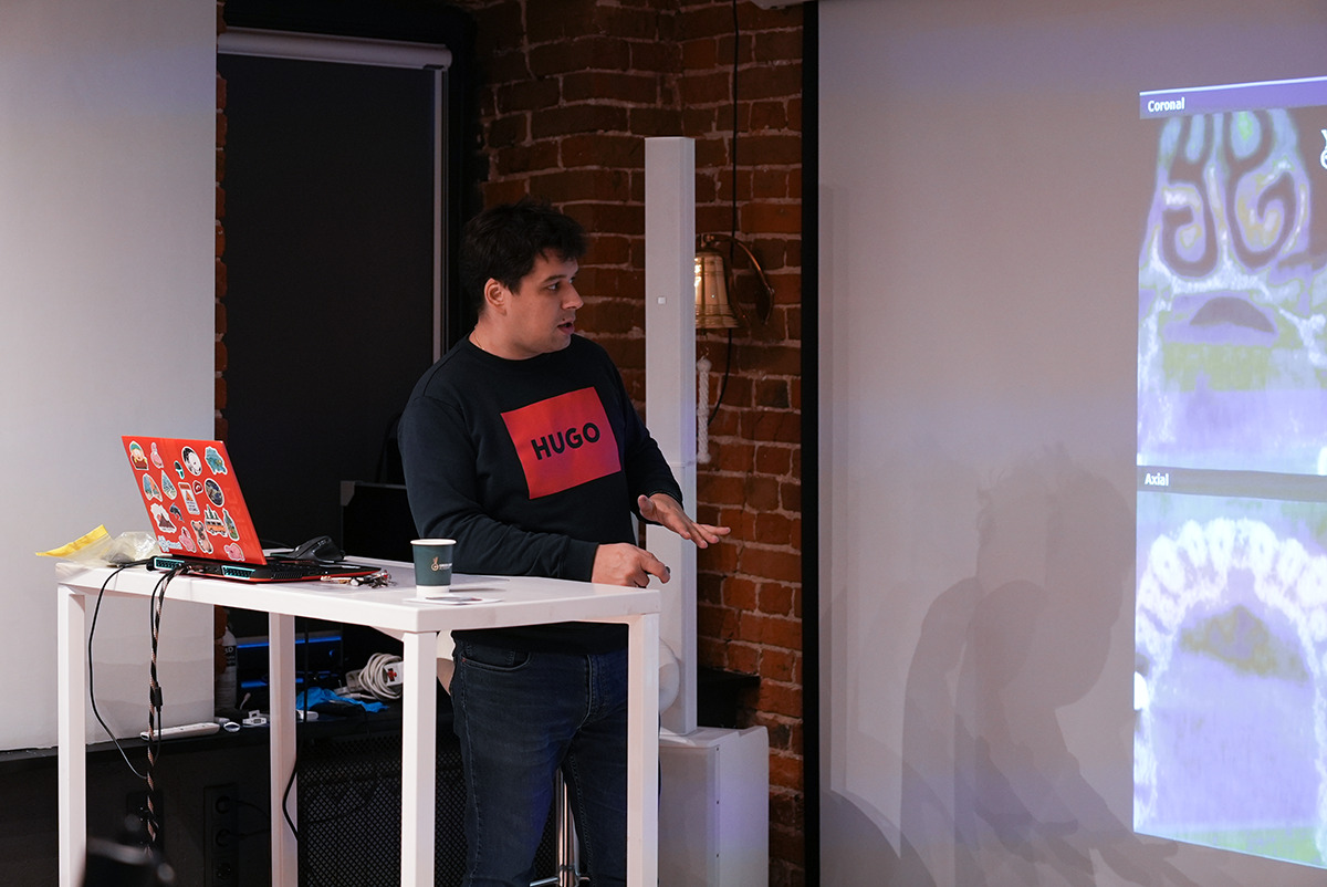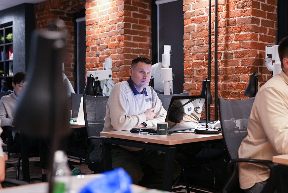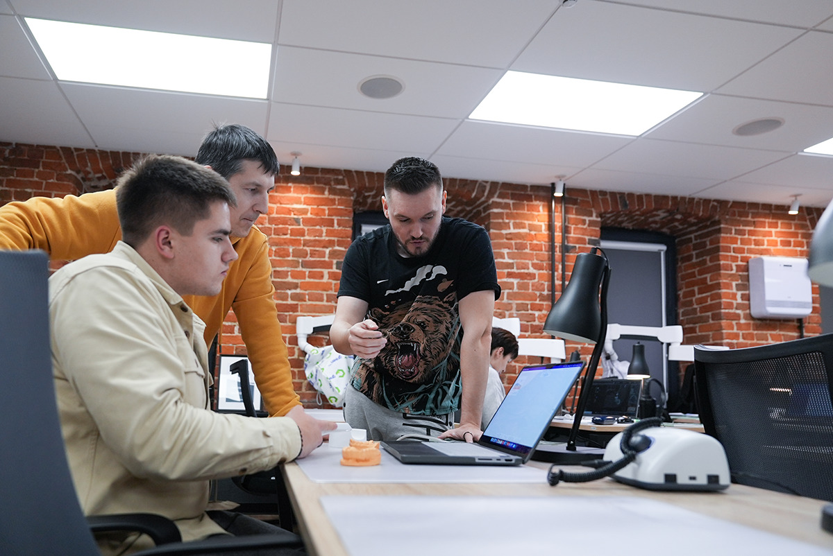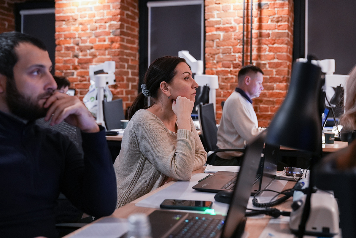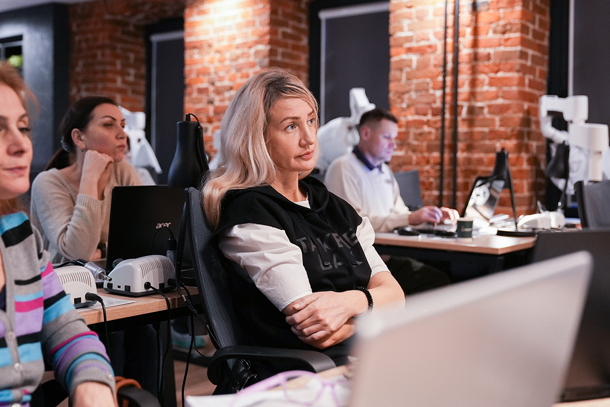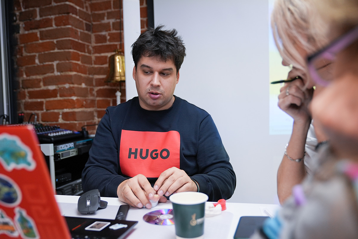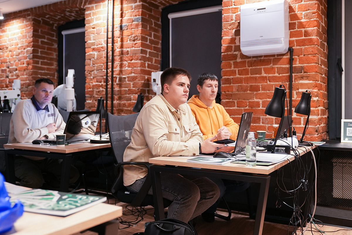 Руки держат высокоскоростной интраоральный сканер Medit i700, глаза направлены на снимок, где видна каждая деталь сканированной области, а уши улавливают новую информацию о рентгенологическом сопровождении дентальной имплантации – это то, что чувствует каждый участник курса Юрия Седова.