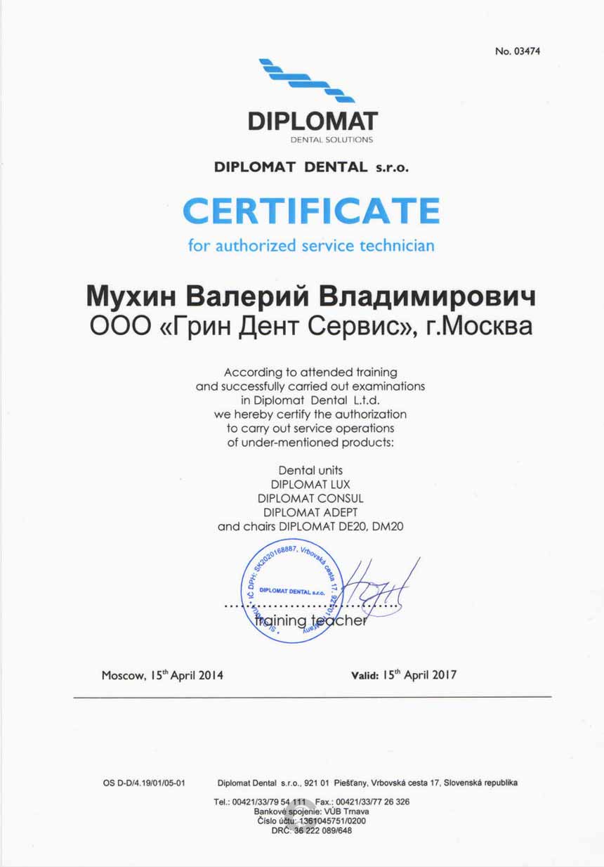 Инженер компании ООО «ГРИН ДЕНТ СЕРВИС», Мухин Валерий Владимирович, успешно прошел тренинг по ремонту и обслуживанию стоматологических установок DIPLOMAT.