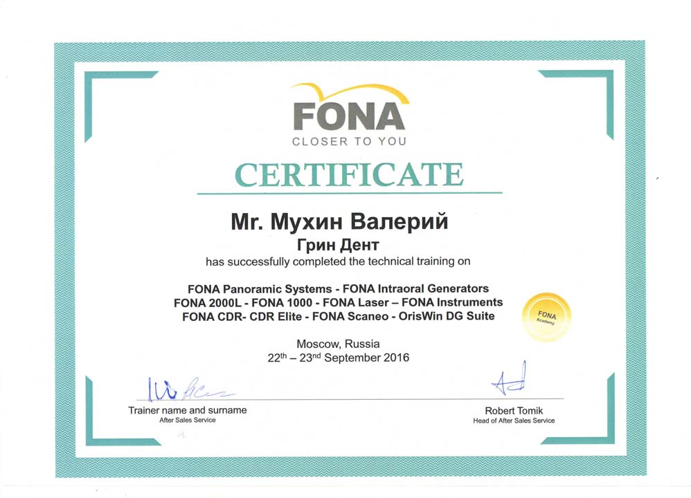 Сервис инженер компании «ГРИН ДЕНТ», Мухин Валерий, успешно прошел тренинг по оборудованию FONA.