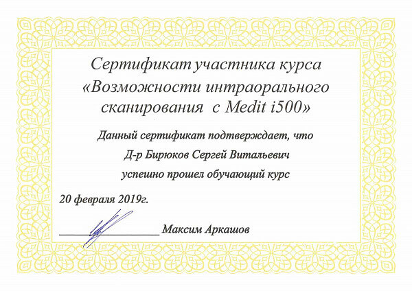 Сертификат участника курса "Возможности интраорального сканирования с MEDIT i500"